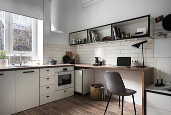 « Le travail sur le projet Odessa a commencé par le fait de trouver unee solution de mise en forme spatiale, en plans 2D. Les clients souhaitaient allouer suffisamment d’espace pour dormir et travailler, ainsi que pour cuisiner et se laver. Aussi surprenant que cela puisse paraître, il semblait y avoir assez d’espace pour toutes ces tâches réunies. De plus, nous avons également pu intégrer au studio une grande armoire. Toutes les zones ont été pensées de façon fonctionnelle. Des couleurs neutres ont été choisies, de sorte que le mobilier ne vole pas l’espace de la pièce« . – Fateeva Design