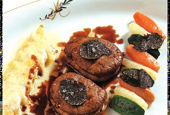 Dressez les filets de veau que vous pouvez agrémenter d'une lame de truffe sur chaque pièce, entourez de macaronis à la crème et de quelques légumes frais. Nappez de jus à la bergamote et servez chaud.