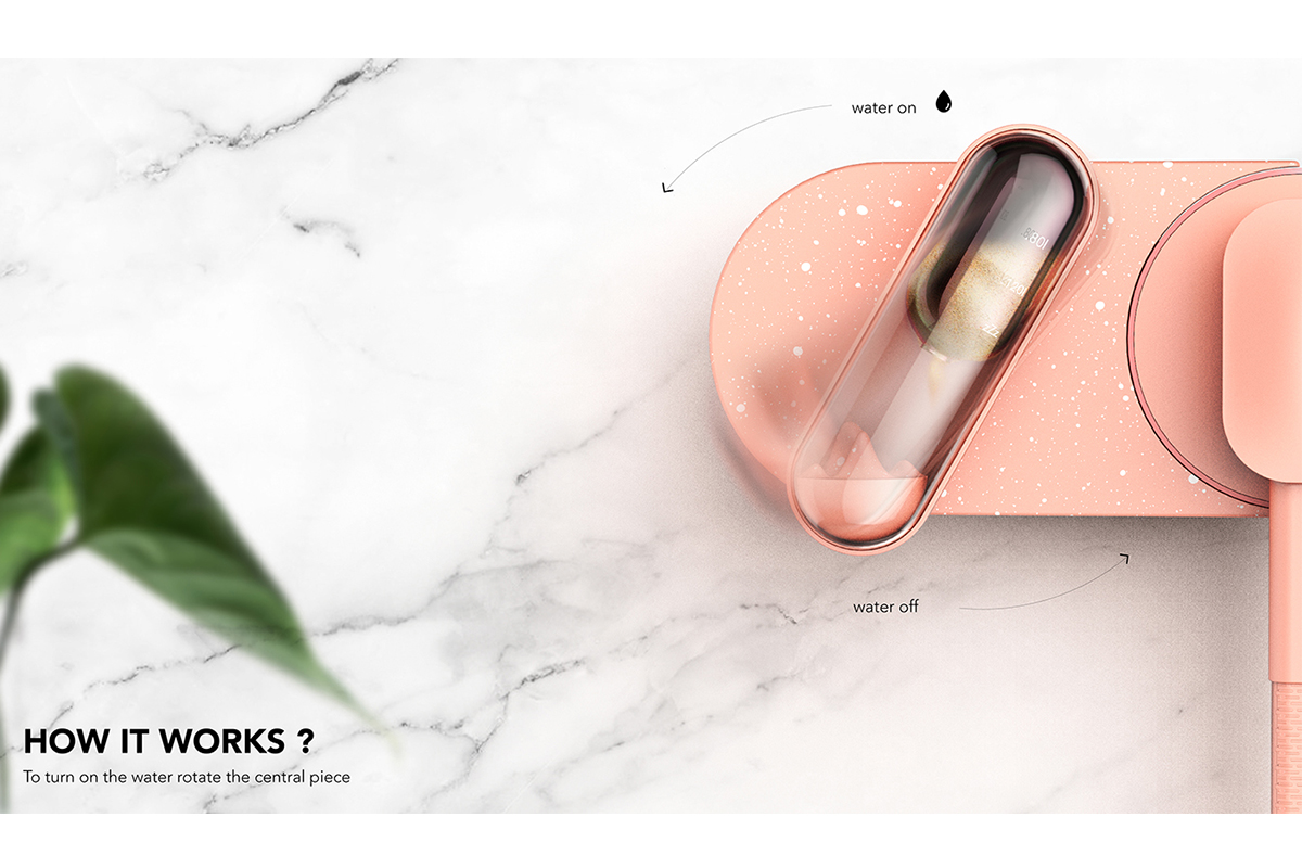 Ce projet représente également une opportunité de repenser le fonctionnement et l’aspect d’un robinet de douche en créant un produit plus épuré, plus simple, et plus coloré qui contraste avec les robinets de douche actuels et qui prend en compte l’importance de la consommation d’eau.