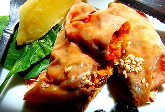 On dépose le tout dans des feuilles de brick (ou de filo épaisses) et on bricole des paquets (ou des aumonières...).