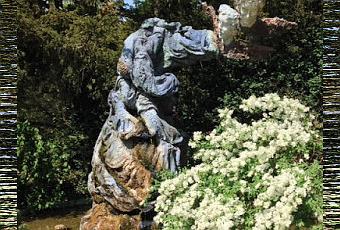 Et Avril très en soleil se défile Se découvre d'un fil à fil Pour défaire sa vêture des jours sombres Qui maintenant l'encombre, Quand des fleurs boules blanches Font se plier des arbustes les branches Et que dans les plis de l'étoffe du temps L'eau discrètement conduit son ruissellement Indifférent à tous ceux qui ici passent, Ombres promeneuses qui bien vite s'effacent, Restent, ces angelots liés l'un à l'autre fidèlement, Un amour passionné polymérisé depuis longtemps Sur lequel les saisons N'ont plus raison.