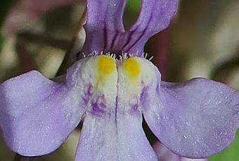 Cymbalaria muralis (Cymbalaire des murs, Linaire cymbalaire) : herbacée vivace glabre ; tiges étalées-pendantes ; feuilles à 5-7 lobes ; fleurs bleues à lilas, tachées de jaune et striées de violet.