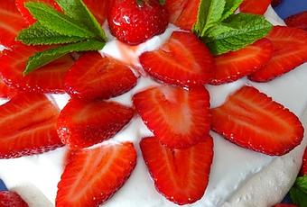 Garnir le centre de la meringue de crème fouettée. Ajouter les fraises et, à l'aide d'un pinceau de cuisson, les napper d'un peu de confiture diluée pour donner du brillant. Décorer éventuellement avec quelques feuilles de menthe. Servir bien frais.