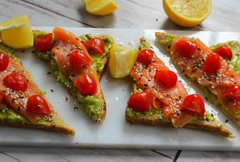 Il suffit d'avoir du pain, de l'avocat et des petites choses pour l'agrémenter. Ici, il est accompagné de tomates cerises, de saumon fumé et de petites graines.