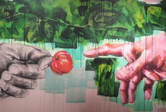 Thierry Tan Sio Po reprend ce symbole des mains qui se tendent l’une vers l’autre et y ajoute un fruit. La main droite est toujours claire, mais la seconde est au fusain. La main gauche ne reçoit plus, elle donne. Elle offre un fruit charnu qu’elle tient par le pédoncule, comme une belle cerise appétissante.