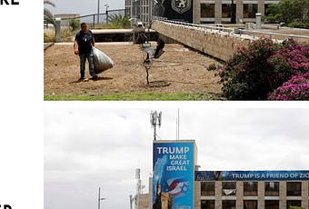 L'article du New York Times en date du 13 mai 2018 a pour titre : « U.S. Embassy Opens in Jerusalem : 9 Things to Know About the City ». Sous le titre figure une photographie du consulat des États-Unis à Jérusalem, bâtiment dans lequel s’installe la nouvelle ambassade américaine après son déménagement de Tel Aviv à la capitale d’Israël. L’installation de la nouvelle mission diplomatique américaine en Terre sainte se déroule le 14 mai, date anniversaire des 70 ans de la Déclaration d’indépendance de l’État d’Israël. Pour fêter l’événement, deux bâches publicitaires recouvrent la façade du bâtiment.