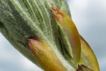 Sorbus aria (Alisier blanc, Allouchier) : petit arbre à houppier ovoïde et écorce grise ; feuilles simples alternes, ovales irrégulièrement dentées, tomenteuses et blanches sur leur face inférieure ; fleurs blanchâtres en corymbe, fruits charnus ovoïdes rouge orangé (alises).