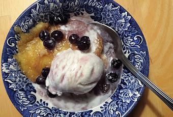Mettre deux grands-pères dans une coupe, couvrir avec une boule de glace à la vanille, et napper de sirop chaud ........aux myrtilles, je crois que je n'ai rien oublié .............MMMMMmmmmmmiaM . Dégustez !