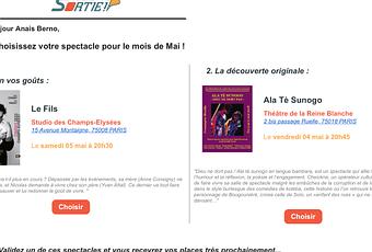 Et voilà ! Après ça, on m’indique par mail que je vais recevoir une proposition le 20 du mois actuel pour une sortie le mois suivant. Puis j’attends (vu qu’on est en début de mois à ce moment-là)… Le 20 avril, comme prévu, je reçois un mail façon « battle » qui me propose deux sorties très différentes. Une pièce de théâtre un peu sombre et une découverte originale, drôle et musicale qui me transporterait à Bamako.