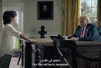 La vidéo de cette année s’empare d’un sujet qui est encore plus d’actualité, à savoir Jérusalem. Elle a pour fil conducteur un enfant qui s’adresse aux grands de ce monde, ou plutôt à leurs sosies : Donald Trump, à qui l’enfant propose de partager le repas de rupture du jeûne s’il arrive à retrouver sa maison dans les décombres ; Poutine qui a droit à un petit discours sur la guerre, tandis que les autres leaders du monde occidental, Angela Merkel, Justin Trudeau et Antonio Guterres, sont montrés en train d’aider des réfugiés ; quant à Kim Jong-un, il secoue tristement la tête devant les ruines de la maison de l’enfant. Dans les dernières séquences, ce dernier va chercher dans sa prison une petite fille qui ressemble à la célèbre militante Ahed Tamimi (en plus jeune), tandis que les paroles reprennent le refrain à propos de la rupture du jeûne à Jérusalem. Encore quelques plans avec les sosies des stars de la politique mondiale et montée finale en zoom arrière sur le Dôme du rocher et son mur (celui de l’enceinte de la ville, pas la « barrière de sécurité » chère aux Israéliens), de telle sorte que l’on découvre que les deux enfants sont désormais encadrés par six adultes portant les tenues traditionnelles du Golfe.