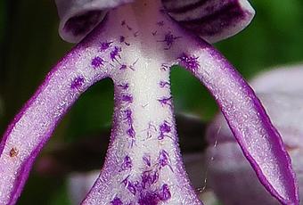 Orchis militaris (Orchis militaire) : tige robuste, verte, parfois lavée de violet à son sommet ; feuilles lancéolées, dressées, les inférieures en rosette, les supérieures engainantes ; bractées membraneuses violacées ; inflorescence dense devenant plus lâche ; sépales gris à l'extérieur, veinés de violet à l'intérieur, en casque couvrant les pétales, labelle rose clair entouré d'un liseré plus foncé, fortement trilobé, lobe médian divisé en deux lobules étroits, séparés par une petite dent, lobes latéraux étroits et pendants, centre du labelle portant des houppes rose-pourpre, éperon court et descendant.