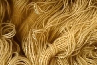 Une fois le bain filtré et la laine plongée dedans, la couleur se diffuse très rapidement dans la fibre.