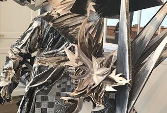 Arrivant par le couloir, j'ai d'abord vu, à travers les vitres, un bouquet de flêches plantées dans un personnage qui semblait se tordre. Et flêches + personnage = Saint Sébastien. Trop facile interprétation ! Quand on se trouve face à cette grande sculpture en carton, on voit bien qu'il ne s'agit pas du supplice d'un homme attaché à un poteau. C'est peut-être un homme chassé par des Indiens dans une scène de western. Ce qui me retient dans cette salle, outre les pièces accrochées aux murs (notamment cet oeil dans un porte-voix), c'est la matière dont est faite la sculpture : du carton. Une sorte d'arte povera.