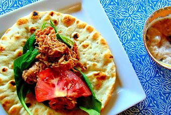Et on sert la chose sur des pitas à la grecque avec des épinards, des tomates, et du yogourt végétal (Yoso amandes et noix de cajou) parfumé avec de l'ail, du citron, du thym, et de l'origan).