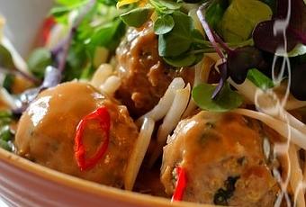 1)Lorsque les boulettes sont cuites, verser la sauce dans un plat de service, ajouter les boulettes et déposer les fèves germées, le basilic, le piment chili et les micro pousses au centre du plat. Servir avec des nouilles de riz ou du riz.