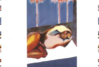 Il est question une fois encore de couple et d’amour. Vous souvenez – vous des couples ludiques de 1990,des diptyques juxtaposant une peinture et une surface d’une matière inattendue ? Cette fois, appareillés ou accouplés aux tableaux, il y a de petits coussins de tissus brodés de perles, à l’évidence des sexes féminins, très séduisants, en cohérence avec le thème d’ensemble : le flux vital des sécrétions féminines exaltées par l’amour et le couple, d’où le titre le lit de mes rivières c’est-à-dire le partenaire, source de cet élan, de cette énergie vers la vie.