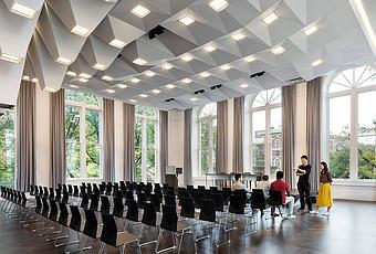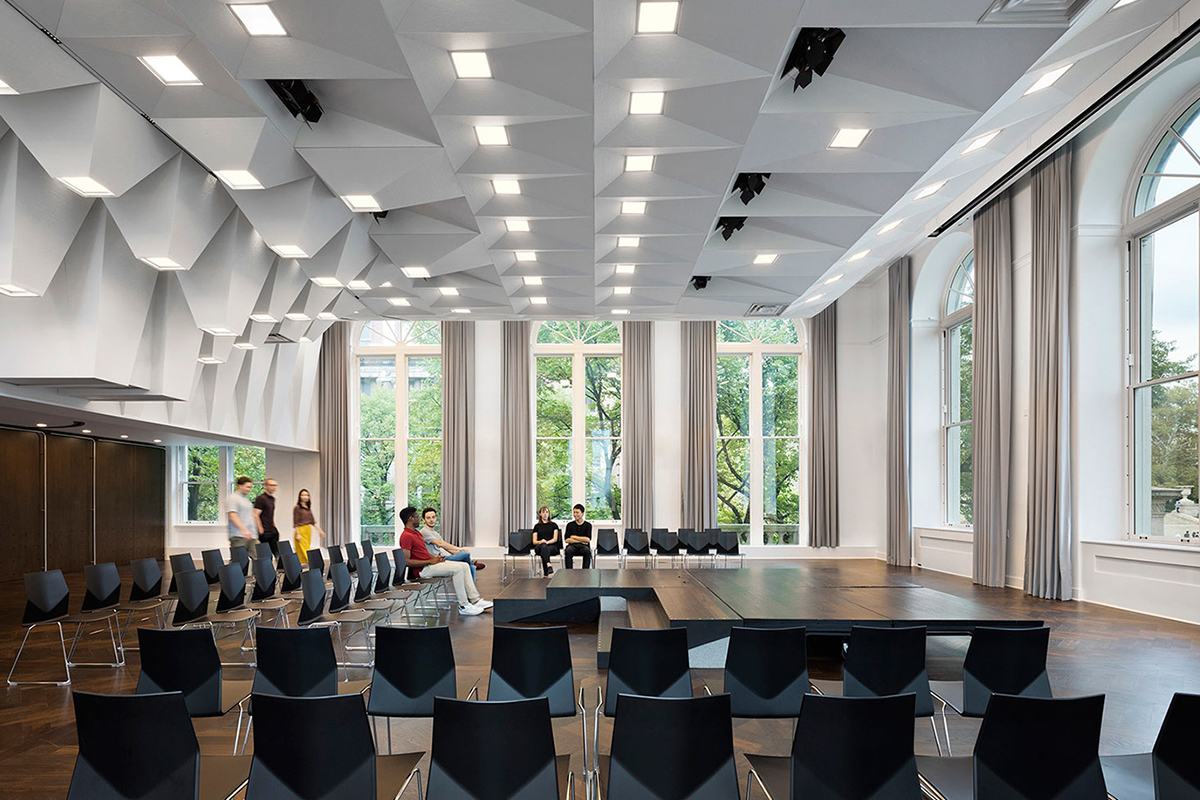 Le projet fait appel à la nécessité de transformer de façon imaginative les installations historiques pour répondre aux besoins éducatifs contemporains en créant un espace qui reconnaît et réinvente son passé. Le plafond personnalisé déploie des techniques de fabrication numérique pour traduire l’architecture historique du coffre en une surface fonctionnelle complexe, formée de modules de feutre acoustique recyclés et conçue pour intégrer tous les systèmes techniques des espaces, des diffuseurs à un projecteur cinématique à grande échelle. Il est conçu pour remplacer un plafond plat suspendu installé généralement lors d’une rénovation.
