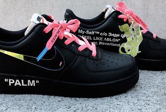 Au premier regard on aurait d’ailleurs pu penser à un nouveau design crée par Virgil Abloh. La silhouette reprend ainsi explicitement les codes établis par le nouveau D.A. de Louis Vuitton. Majoritairement noir ce custom affiche donc les concepts devenus traditionnels des modèles passés entre les mains de Virgil Abloh. Néanmoins Palm Angels ne s’est pas limité aux grands axes de The Ten, dans ce sens la silhouette exprime les caractéristiques de la culture rave avec des coloris fluo utilisés comme ce rose et ce bleu vif qui ornent les lacets. Le Swoosh principal semble afficher un visuel digne d’un miroir quand le logo Palm Angels accessoirise le modèle à la façon des pendentifs XL des rappeurs. Enfin les lettrages “Palm”, “My-Self ™” ou encore “I feel like Abloh” affluent dans le même sens, Palm Angels a clairement voulu rendre hommage à l’homme qui surfe actuellement sur la planète mode. Ce custom propose donc un final cohérent fort d’un design saisissant et bénéficiant d’une boxe néon red tout aussi attrayante. Pour le moment aucune information officielle concernant la release de cette silhouette qui on l’espère ne sera pas limitée aux F&F.