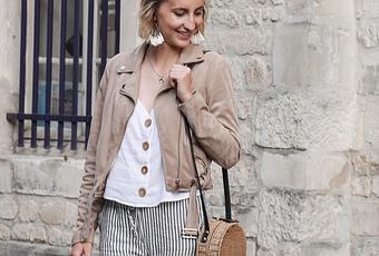 Pour cette tenue, j'ai ressorti mon pantalon à rayures ainsi que mon petit sac en osier pour accentuée ce côté campagne, dans le sens chic du terme. Vous savez, les champs parfaits pour de jolis picnics au soleil.