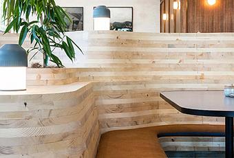 L’équilibre entre le naturel et l’humain est particulièrement visible au bar. Un long comptoir de béton qui s’étend sur tout l’espace contrebalancé par l’utilisation de pin massif sablé en bandes horizontales. La pièce maîtresse du lieu est sans conteste la banquette sculpturale qui se déploie organiquement à travers l’espace, se surélevant pour créer un dossier confortable à cette assise. Fabriquée à partir de bois lamellé-croisé, les contours de l’installation sont inspirés par la topographie montagneuse qui entoure la ville.