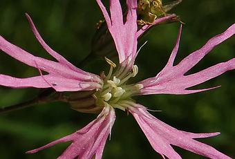 Lychnis flos-cuculi (Lychnis fleur de coucou) : herbacée vivace légèrement pubescente à tige dressée, glanduleuse, ramifiée dans le haut ; feuilles opposées, oblongues à lancéolées ; calice rougeâtre garni de 10 nervures saillantes, fleurs à 5 pétales roses divisées en 4 lanières inégales.