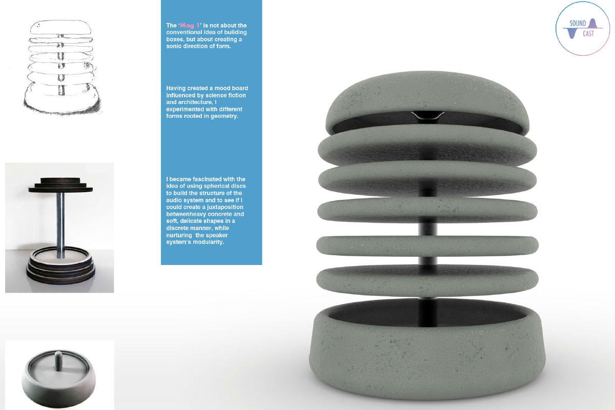 – Pour un projet scolaire, le sujet consistait en le fait de créer un système de musique explorant la forme de l’objet. J’étais très intéressé par la continuité de l’utilisation du béton dans mon design. J’ai créé une moodboard avec des influences de l’architecture et de la science-fiction. Je souhaitais explorer le travail de l’écrivain Isaac Asimov à travers les relations des gens avec la technologie. J’ai ensuite écrit une courte histoire dans un style «Retour vers le futur» en explorant ce que c’était il y a 100 ans, actuellement, et j’ai prédis la direction que cela prendra dans 100 ans. C’était un lien clé pour mon projet.