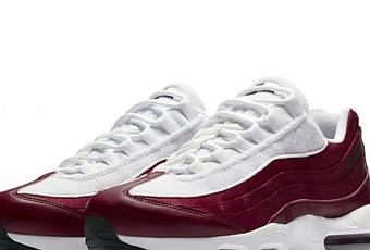 Certaines des plus belles Air Max 95, depuis 2 ans maintenant, sont réservées à la gente féminine et cela agace particulièrement les hommes qui font plus de 44,5. Il faut dire également qu’au dessus du 41/42 il est difficile de trouver des revendeurs proposant des modèles femme jusqu’au 44,5. On se rappelle des dernières éditions de la Air Max 95 comme la Rio Teal en édition femme qui en avait déçu plus d’un. Cette version luxe (LX) propose une empeigne aux multiples matériaux, mais dans un colorway ultra simpliste. L’upper se compose d’une matière chenille de couleur blanche sur la languette, oeillets et lacets. En dessous de cette partie blanche, séparée par une bordure tisée, un tissu finition satiné de couleur bordeaux habille certains panels. Le garde-boue et le talon sont en cuir de la même teinte, et la midsole blanche contraste l’ensemble. Le petit Swoosh au niveau de la cheville est ici remplacé par un NSW (Nike SportsWear) brodé en noir, on retrouve également cette typographie sur la semelle de propreté.