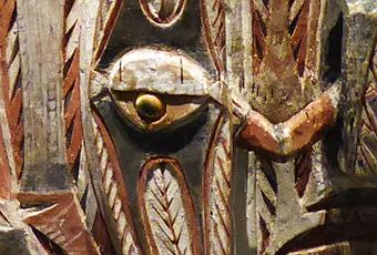 Photo : détail d'un panneau Malaggan - Kapaterong, Nouvelle-Irlande 1880 - Coll. Otto Finsch. © Weltmuseum, Vienne. Photo de l'auteure, avril 2018.