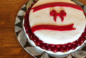 Décorez à votre convenance avec la pâte d'amandes et les demi griottes restantes.