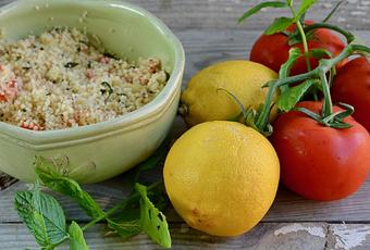 Dans saladier mettre la semoule, arroser avec le jus des citrons, l'huile d'olive et un peu de sel. Bien mélanger.