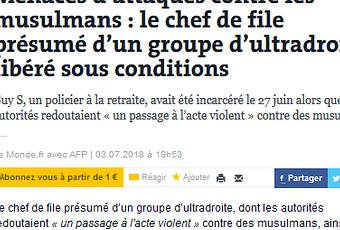 sourceOn peut donc, dans notre pays, préparer tranquillement des attentats contre des musulmans, projeter de tuer des femmes dans la rue au hasard sous le seul prétexte qu’elles seraient voilées, constituer un arsenal de guerre (36 armes à feu et des milliers de munitions ont été retrouvées lors des perquisitions), monter un laboratoire de fabrication d’explosifs… et se voir libérer en quelques jours seulement. Avec pour seule sanction illusoire la menace ridicule d’un contrôle judiciaire… Les bras m’en tombent. Serait-ce l’ancienne profession de ce retraité qui serait en cause ? On est en droit de se poser la question… Étrange décision, d’un laxisme confondant. Deux poids, deux mesures. Une décision d’autant plus étonnante que pour des tags sur le consulat d’Algérie à Lyon, un autre de ces bas du front, lui aussi policier, a été condamné à 3 mois de prison avec sursis pour dégradation et apologie d’acte terroriste. Ses tags faisaient justement référence au groupe terroriste d’extrême-droite précité, AFO.