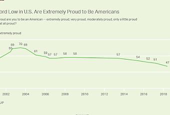 Pour la première fois au cours des 18 ans pendant lesquels Gallup a demandé aux citoyens américains s'il étaient fiers d'être Américains, seulement 47% ont déclaré que c'était le cas, contre 51% en 2017, et bien en dessous du niveau de 70% atteint en 2003.