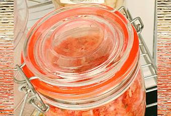 Dans un saladier, mélanger tous les autres ingrédients pour faire la pâte d’épices. Étaler ensuite la préparation entre les feuilles de chou. Ensuite tout mélanger uniformément et mettre dans un grand plats couvert ou bien mettre directement en pot.