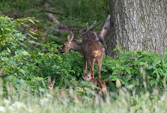 Deux petits êtres tachetés pointent rapidement le bout de leur nez et se ruent sur la chevrette. Les faons émettent de petits sons satisfaits en approchant leur mère. Elle les lèche brièvement en retour avant de les laisser boire un peu de lait. Bien dissimulée par les herbes hautes, la petite famille de chevreuils disparait durant de longues minutes avant de réapparaitre dans une trouée. Je peux enfin déclencher et faire quelques images de ces belles retrouvailles.