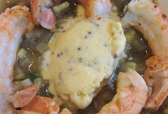 Passer les queues de langoustines quelques secondes dan une poêle avec un soupçon d'huile d'olive. Poser une quenelle de glace à la moutarde sur le minestrone et déposer 4 langoustines encore chaudes tout autour.
