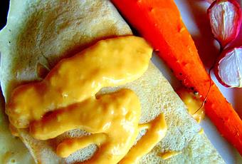 On prépare une béchamel (un roux... du lait amande-coco... et du frauxmage (celui qu'on a! le bon vieux orange Daiya prend ici tout son sens) et quelques fines rondelles de fleur d'ail).