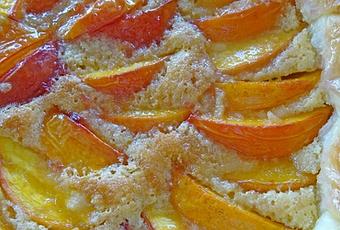 Déposer la pâte feuilletée dans le moule à tarte avec sa feuille de cuisson. Piquer le fond et verser la crème, bien l'étaler uniformément puis placer les tranches de nectarines.