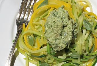 600 g de courgettes (bio et de couleurs différentes, si possible) Le zeste et le jus d’un citron non traité 1 gousse d'ail épluchée2 belles poignées de feuilles de basilic, lavées4 cuillères à soupe graines de tournesol (ou de courge, ou de noix – amandes, noisettes, noix, noix de cajou trempées une nuit)2 – 3 cuillères à soupe d'huile d'oliveDu sel de mer et du poivre noir du moulin
