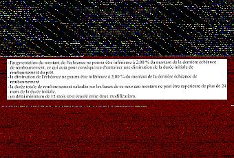 On entend souvent les banquiers parler de mensualités « modulable », mais si vous n'y portez pas garde, vous risquez d'avoir des déception sur la flexibilité réelle du mécanisme. D'abord il faudra attendre 24 mois. Ensuite la modification à la hausse ou à la baisse ne pourra pas dépasser 2% soit 20 euros sur une mensualité par exemple de 1000 euros. Est-ce que 20 euros peuvent faire la différence ? on peut se permettre d'en douter. Il est possible de rabaisser encore la mensualité, mais il faudra attendre 12 mois avant de pouvoir le faire. On peut difficilement parler d'un aménagement vraiment utile.