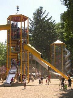Je croyais que le bateau pirate avenue Monterey, à Luxembourg, était le nirvana du parc pour enfants : des échelles de corde pour étrangler ses petits copains, des balançoires pour se déchirer les genoux, des toboggans vertigineux pour s'éclater les quenottes, des animaux en bois pour jouer à saute-mouton avec atterrissage dans les cailloux, de l'eau glacée pour choper une angine en plein mois de juillet, un bac à sable pour enterrer les clés de voiture de papa, une marchande de glaces pour soigner ses caries, des jouets à bascule pour se tordre les bras.