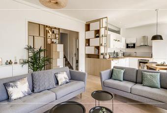 Toute la décoration a été repensée dans un esprit scandinave cosy. Pour renforcer l'esprit cocon, nous avons réalisé un meuble claustra afin de séparer l'entrée du séjour.