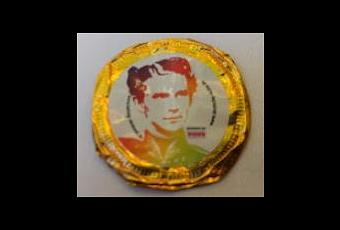 Emballage de chocolat distribué lors de la CSD (ou Christopher street day, gay pride, marche des fiertés) munichoise 2018 par les promoteurs de la (re)construction du monument au roi Louis II de Bavière sur le pont Cornelius à Munich. www.ludwig-denkmal.de.