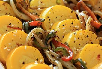 3 belles courgettes jaunes 2 poivrons blancs 1 poivron violet 1 poivron rouge huile de noisette vinaigre sel et poivre sésame blanc