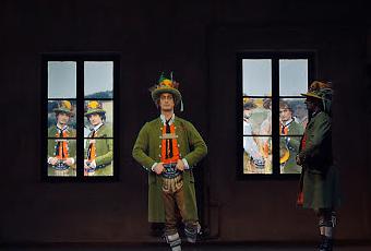 La scène de la vieille salle de cinéma bayreuthoise du Reichshof porte un caisson ouvert avec portes latérales et deux fenêtres, une pièce totalement dépouillée. Pas de chanteurs ni d'orchestre sur scène , les musiciens de l'Ensemble Ictus et le superbe Choeur Cantando Admont se sont placés tout autour des spectateurs et sur le balcon arrière du cinéma, constituant comme un cocon sonore qui va bercer l'auditoire pendant les 90 minutes que dure le spectacle, un véritable environnement musical. Pas de chanteurs sur la scène mais deux acteurs danseurs en tous points identiques (ce sont des jumeaux, cela ne s'invente pas, les frères Jirí et Otto Bubeníček. qui vont mimer l'action tout en se mélangeant avec d'extraordinaires hologrammes qui les démultiplient encore. Souvent le corps d'un ou plusieurs hologrammes se confond avec le corps d'un des acteurs au point qu'on ne sait jamais qui est qui et que souvent l'illusion est si parfaite qu'il est difficile de discerner le personnage réel des hologrammes. Les deux frères ont de costumes et des chapeaux à plumes eux aussi identiques, conçus par Pia Janssen, évoquant sans doute le costume de fête des villageois du 17eme siècle autrichien. Un extraordinaire travail de vidéo, créés par Friedrich Zorn, donne l'illusion de la neige qui s'abat à l'intérieur de la pièce sur scène, ou fait défiler les paysages au-delà des deux fenêtres
