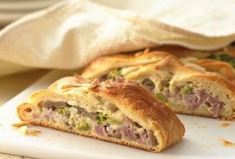 Étalez votre pâte avec un rouleau pour formez un rectangle, déposez-la sur la plaque puis étalez la moutarde avec mayonnaise eu centre, en dessus repartissez à la fois fromage, jambon, champignons et brocoli.