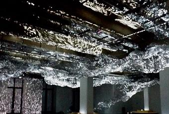 L’installation de la compagnie Adrien M & Claire B se développe dans l’ensemble du volume grâce à un fin voile de métal formant des nuages suspendus sur lesquels sont projetées des particules blanches en mouvement. Organisme sonore et plastique, l’oeuvre devient interactive car modulée par les visiteurs au rythme de leurs déambulations, de leurs gestes et de leurs haltes. Le compositeur Olivier Mellano a créé un environnement sonore spécifique pour cette installation.