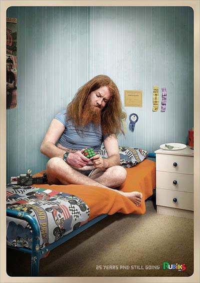 Ces images proviennent de l'agence de communication DDB en Nouvelle-Zélande pour le fameux Rubik's Cube ! Le slogan "25 years and still going" est parfaitement adapté pour l'occasion et cette campagne montre bien à quel point le jeu peut encore laisser perplexe son propriétaire. Vous remarquerez aussi que les personnnages coincés dans le casse-tête arborent une tenue qui doit être aussi vieille que le cube..