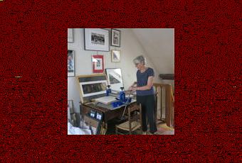 Et nous voici dans la cuisine. Pinceaux, plumes d’oiseaux (pour passer l’acide), pointe, burin, crayons occupent des pots, là où on attendrait cuillères à sauce ou couverts à salade! « Je crois que je fais davantage de peinture que de cuisine! » Dans le placard, sont rangés les produits toxiques pour la gravure!