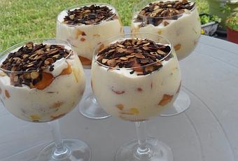 Temps de préparation: 30 mn Temps de réfrigération: au moins 4h Ingrédients: pour 4 personnes: - 6 pêches jaunes - 8 abricots - 100 g d'amandes effilées - 250g de mascarpone - 4 œufs - 100g de sucre en poudre - fleur d'oranger - 1 pincée de sel Préparation:1) Laver les fruits puis les essuyer