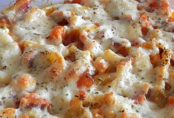 Comme il me restait une courge butternut à utiliser rapidement, j'ai cuisiné un gratin de pâte et de courge qui a comblé tous les estomacs de ma tribu.